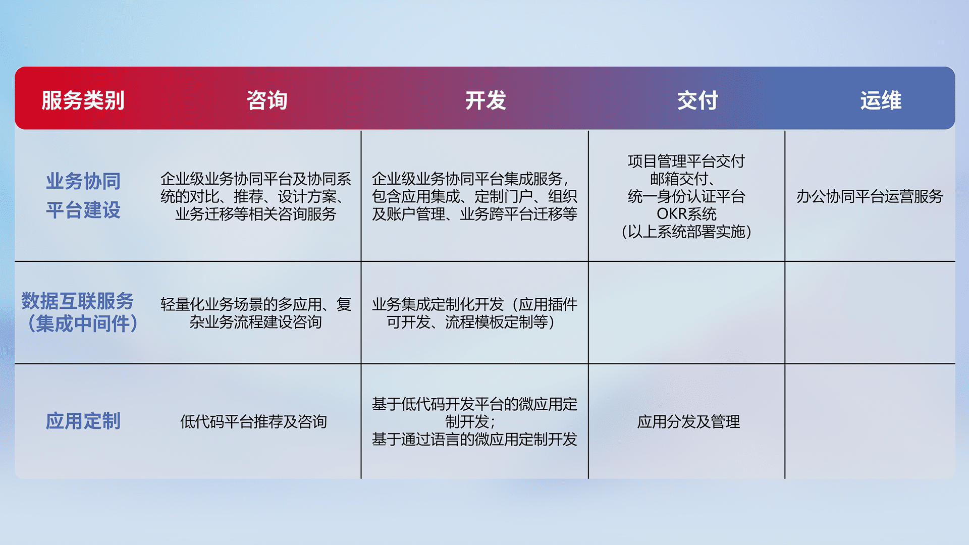 针对钉钉、、、、企微、、IDaas等平台级产品提供产品的规划、、、、方案、、、、交付、、、、定制化开发等服务,,,,实现如统一协同办公、、智能客户服务、、、、混合会议管理、、、、智能数据查询、、、等业务场景,,实现数字化转型。。。